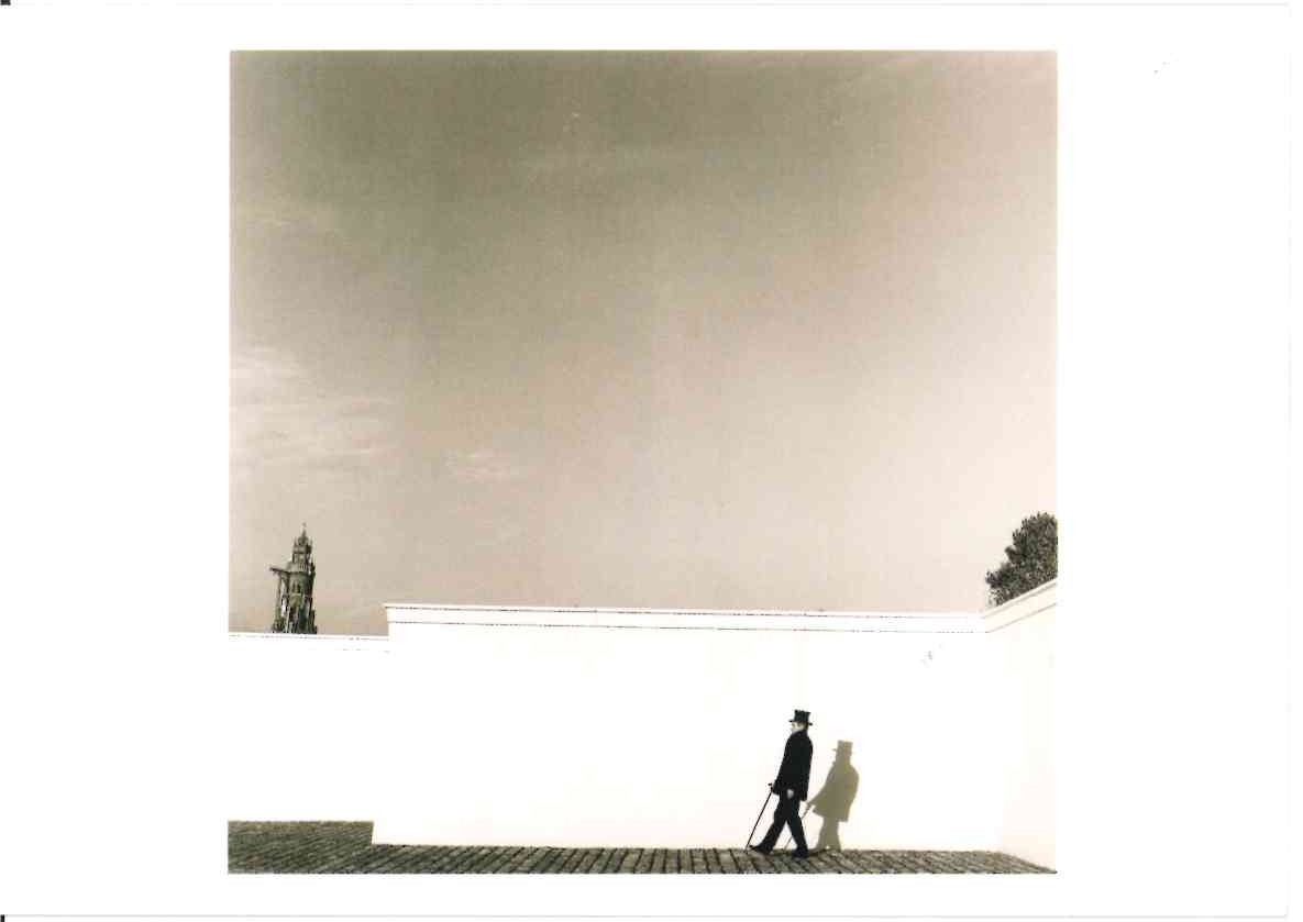After that, things quieted down for the photographer. But in recent years, he has returned to the public eye with new photographs and exhibitions. His photographic subject matter ties in seamlessly with his earlier work. Andreas Bohnhof’s images are clearly rooted in history, specifically in the New Objectivity movement of the 1920s. This is particularly noticeable in the composition of his architectural photographs. The choice of framing and the use of light are reminiscent of the beginnings of modern photography. In the daily flood of colorful and digitized images, Andreas Bohnhoff delightfully highlights the almost forgotten quality of the seemingly dying genre of black-and-white photography. However, the photographer does not limit himself to the technical and stylistic adaptation of famous role models. His motifs are remarkable. Among the recognizable architectural spaces, one might discern a gentleman in antique clothing. Or a man striding in front of a bright, smooth new wall of recent date. He casts a long shadow, and above the wall rises the spire of a neo-Gothic lighthouse, whose masonry is as historic as the clothing and demeanor of the flâneur. Andreas Bohnhoff stages his photos, his portraits, his still lifes. And these stagings are unsettling. They are subjective, obviously deliberately arranged by the artist. In front of his camera, the apparent photographic reality becomes a stage, a stage for surreal-seeming narratives, told with technical perfection in timeless photographs. The current exhibition was made possible with the support of the Chamber of Employees.