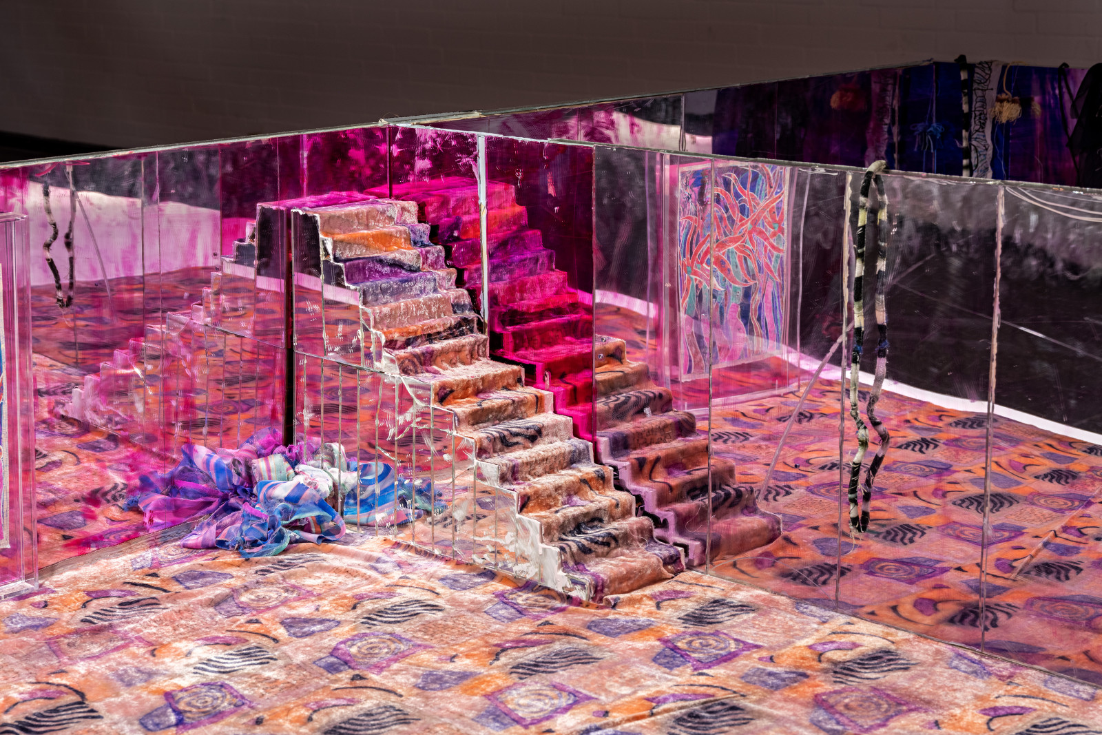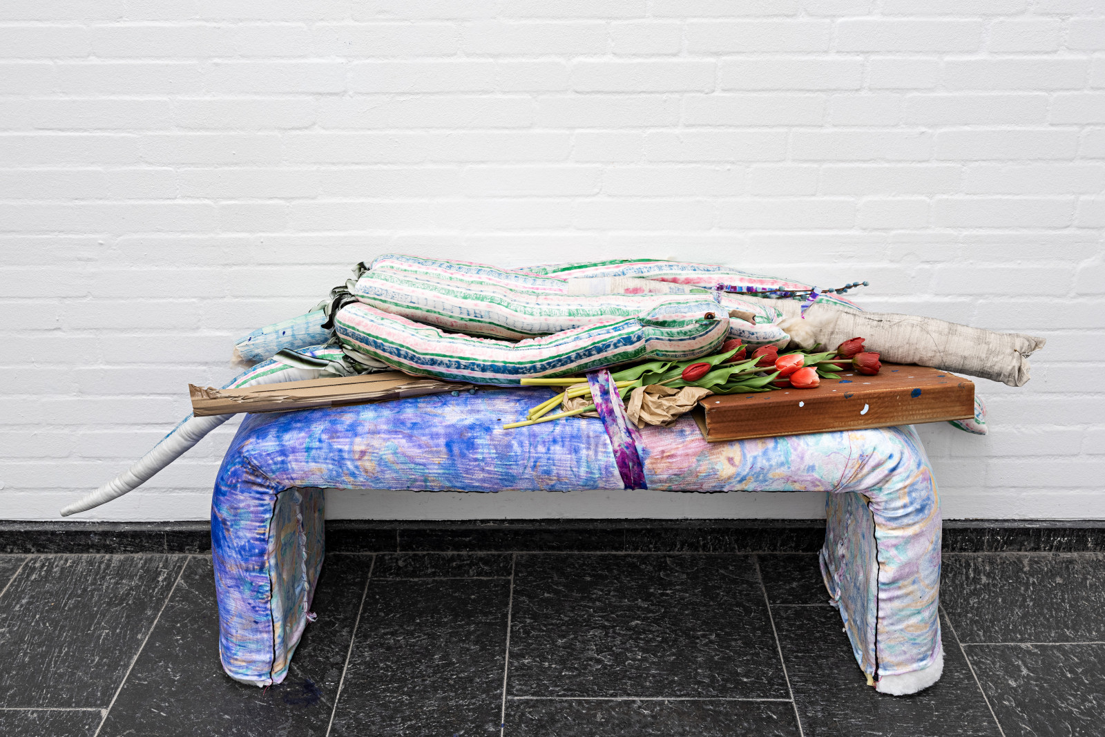 Bourse’s works start with a broad range of references usually drawn from pop culture, like the cult series “Columbo” or “The Simpsons” or the legendary, former Parisian nightclub “Le Palace.” Resembling a poetic web woven out of Bourse’s personal desires and obsessions, these references permeate the entire exhibition and are embedded in the artist’s highly idiosyncratic, aesthetic universe. Her works and exhibitions are replete with certain pastel colors, painted mirror surfaces and textiles (usually silk) as well as recurring patterns and motifs (stripes in Bremerhaven). The artist’s working method is extremely meticulous and repetitive. She creates her pieces by applying paint innumerable times to the underlying material in a reiterative, monotone and excruciating process that can take hours or days, and by the tedious production of objects with tools and methods she does not master but appropriates by watching DIY videos on YouTube. Hence, a temporal dimension as well as performative and artisanal elements are inscribed in her works. It’s as if she were intent on narrating something very slowly and on narrating it herself. Here, too, a struggle for intensity can be sensed, namely, the desire to go through something, to personally experience something, and in doing so, to occasionally abandon oneself—even if it is ambivalent, at once satisfying and painful. What she creates here, however, are not “real” carpets, “real” lamps, “real” mirror walls or Tiffany windows, but only her fantasies. The mattresses made of silk, for example, are totally unsuitable for actual use.