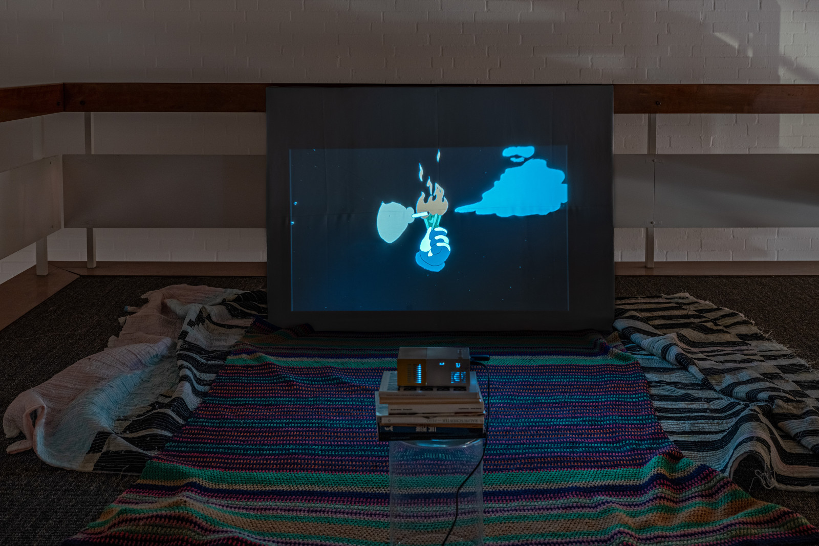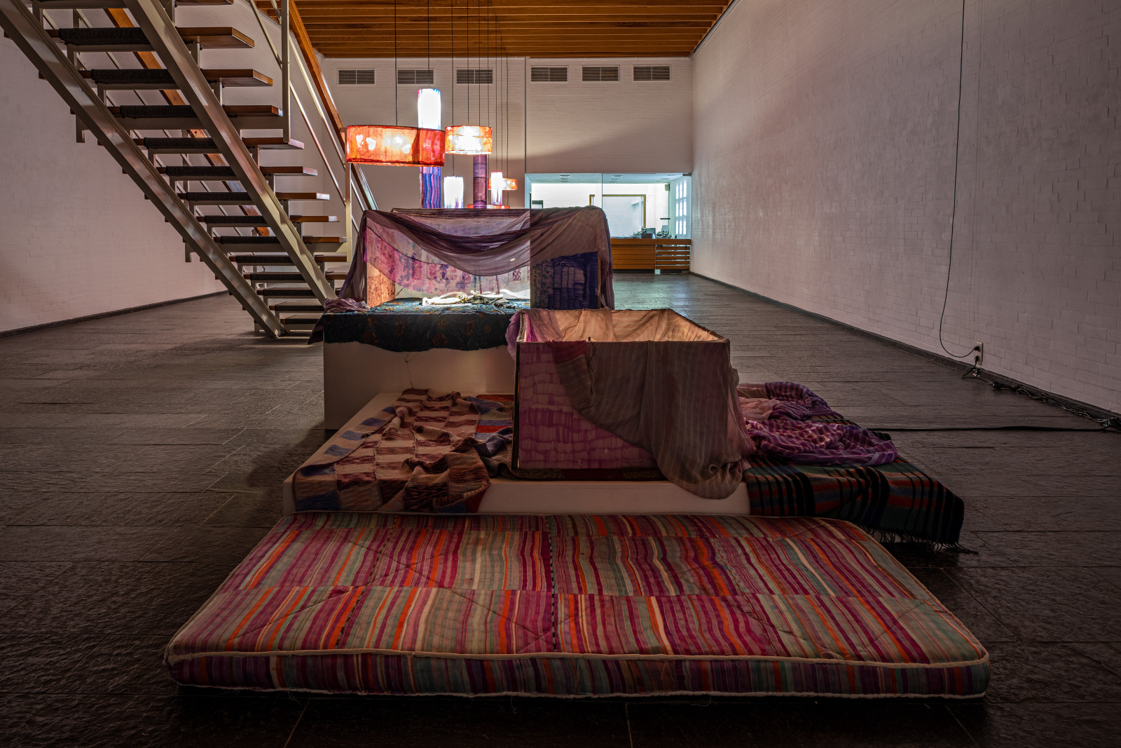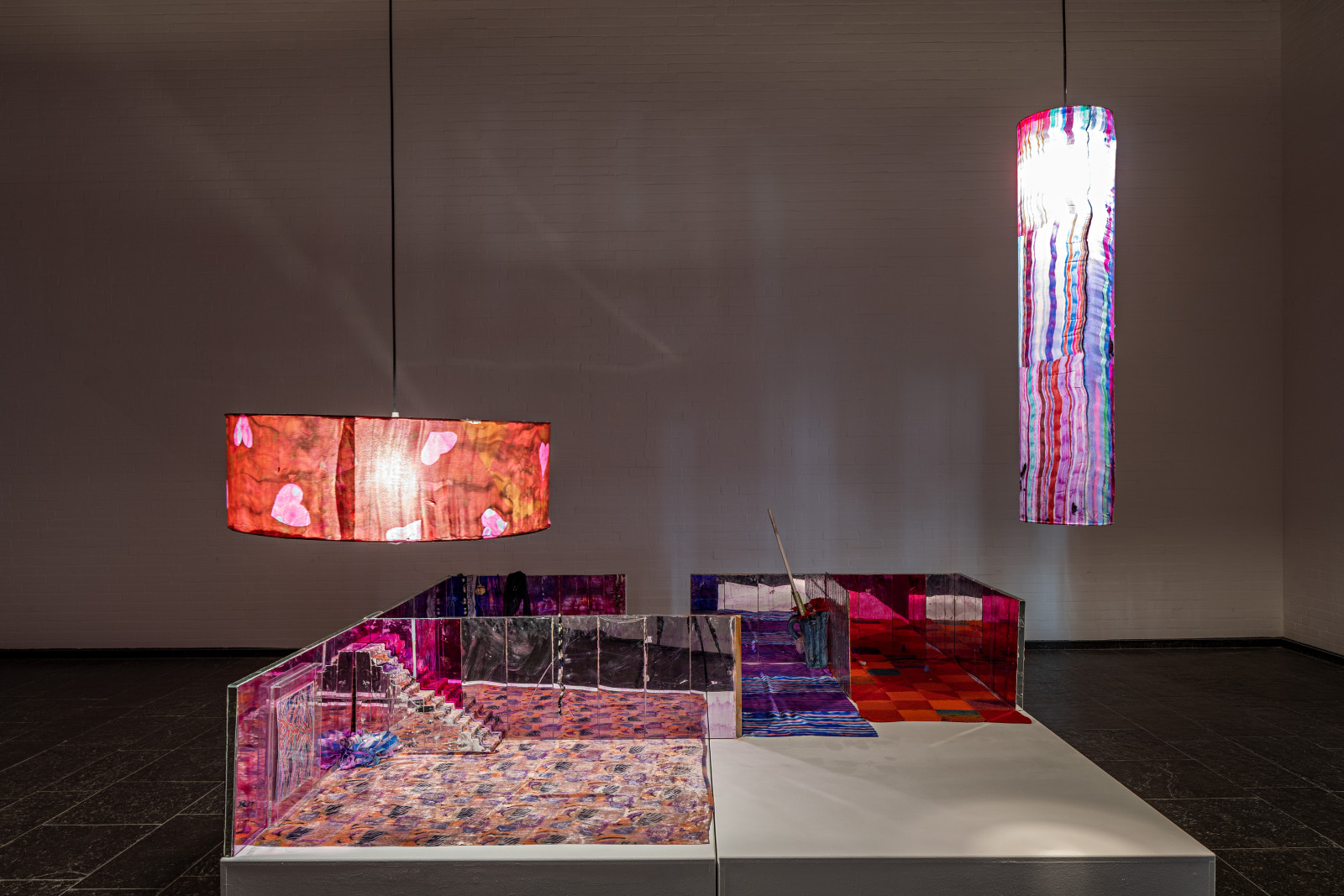 Bourse’s interest lies somewhere in these private or, to be more precise, social spaces, in which intimacy occurs and desire comes to light. The glass entrance door to the Kunsthalle is already covered by a curtain, so that the usual view to the inside is obstructed. What otherwise signals openness and invites the visitors to enter the rooms suddenly becomes a “barrier.” Or, seen the other way around: What takes place inside is screened from the outside and protected against intruding gazes. With mattresses, lamps and blankets, the show contains further objects suggesting a private space. Placed next to them—like a room inside a room or an echo of the real room that Bourse created for the Kunsthalle—are models or fragments of models of other spaces: social locations like nightclubs or hotel hallways; places, then, that bear the promise of intensity.