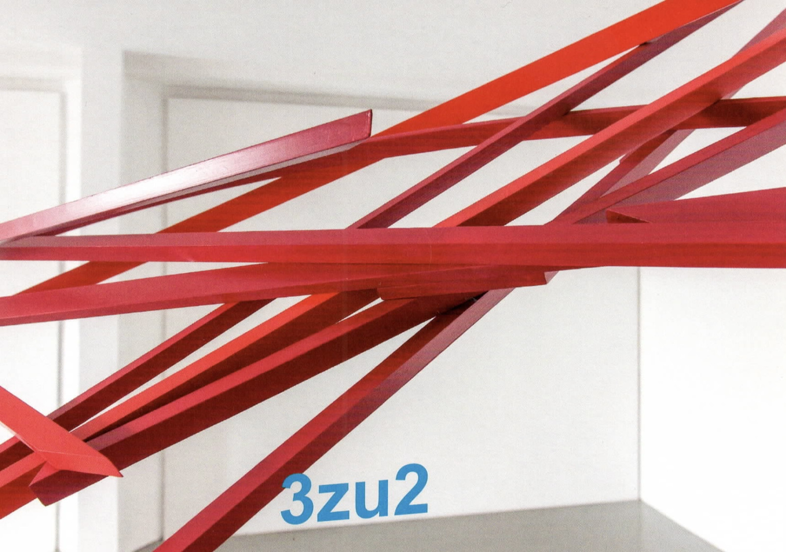 A fragile structure made of red and white painted wooden rods of varying thickness and length, sometimes straight, sometimes curved, which is attached to a few points on the walls and ceiling of the room. The work developed for the Kunstverein derives its form from the dialog with the architecture, from the spatial environment, which does not function as a backdrop but becomes an integral part of the work.