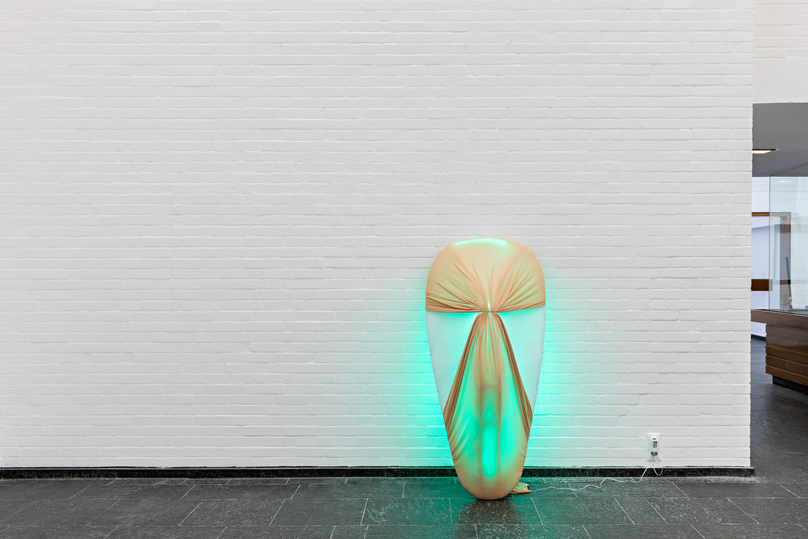 Daphne Ahlers (*1986) works in the field of sculpture. Her pieces play with associations invoking the body or corporeality, with the focus on the separating or sorting attributions inscribed in gender. The modes of thinking and acting, the forms and symbols, which are based on these (patriarchal) structures or also reproduce them time and again, are humorously evoked in Ahlers’ works that do not shy away from erotic charging, to then comment on them, rework and subvert them, and transform them into “alternative forms of expression.” Her works draw on historical and pop cultural references: be it the “Witches’ Well” of Edinburgh Castle, a monument remembering the persecution and execution of more than 4,000 alleged Scottish witches, or the motif of the codpiece, an element of male fashion in the 15th and 16th century as well as a protective piece of clothing in today’s marshal arts. For her works, Ahlers coined the terms “soft sculpture,” for which she mainly uses soft and malleable materials such as foam, latex and textiles, as well as “shell sculpture” based on forms “meant to protect something soft against violent impact.” So the soft, supple and adaptable worthy of protection possesses an important meaning for Ahlers. It is an attitude, so to speak, a kind of positive demarcation or resistance against hardness and can be understood as a potential or symbol of the possibility of social discourses becoming malleable.