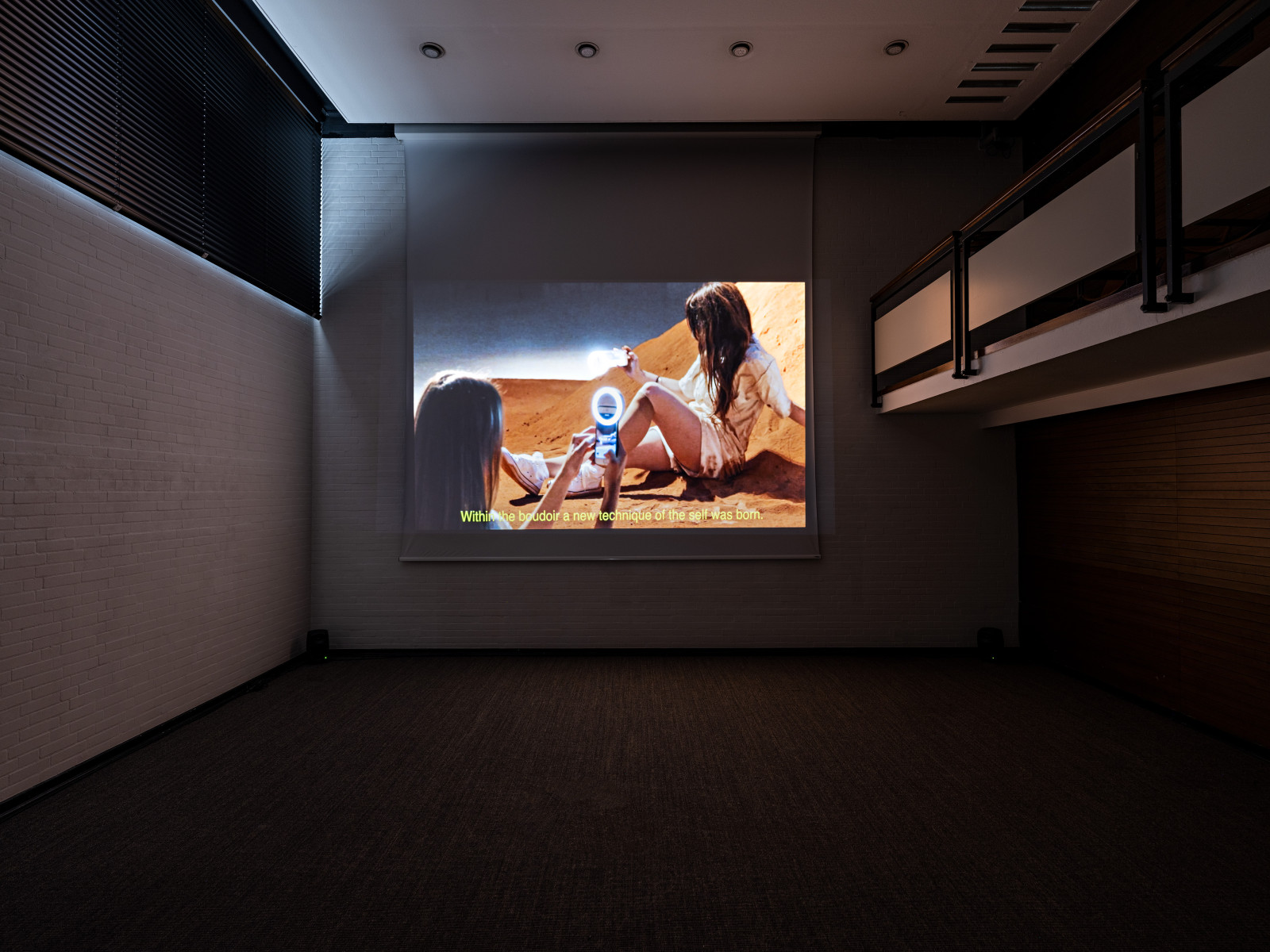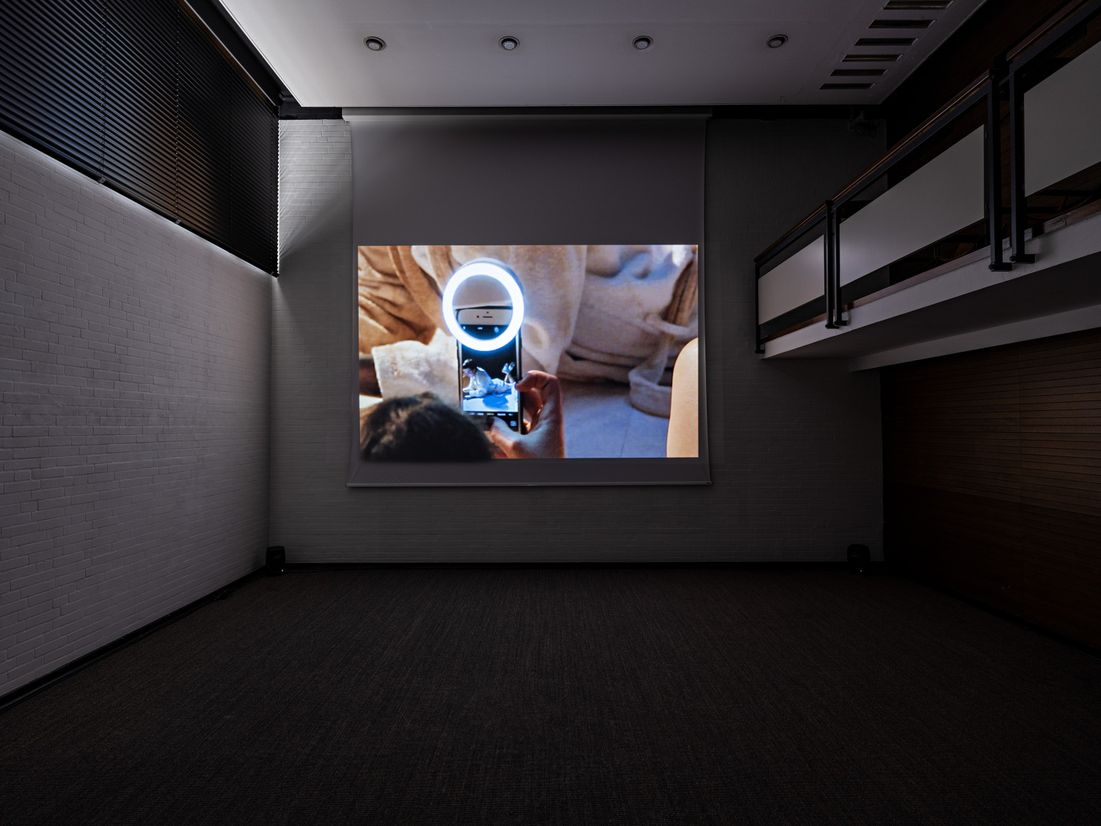 “The video YGRG14X: READING WITH A SINGLE HAND (2018) examines the solitary act of reading as an intimate and multisensory experience by drawing attention to the entire body and away from the gaze. YGRG14X consists of video documentation of an early performance of the YGRG Manifesto and Paul B. Preciado’s text Gender, Sexuality, and the Biopolitics of Architecture: From the Secret Museum to Playboy, in which Preciado demonstrates how female reading was confined to the space of domestic withdrawal and how both reading and sexuality were internalized. YGRG14X: READING WITH A SINGLE HAND explores an environment and set of gestures that point to the boudoir at the end of the eighteenth century, where reading produced what Preciado refers to as the modern “synthetically mediated” understanding of sexual experience, especially masturbation, “growing out of reading and extending to the non-organic world, to smell, vision, and touch.” In the text, the book—and in the case of the performance, the iPhone, which is used by the performers as a tool for reading, filming, and lighting—functions as an interface for the individual experience of subjective thought, physical pleasure, and imagination—a carrier of knowledge and a recording device.”