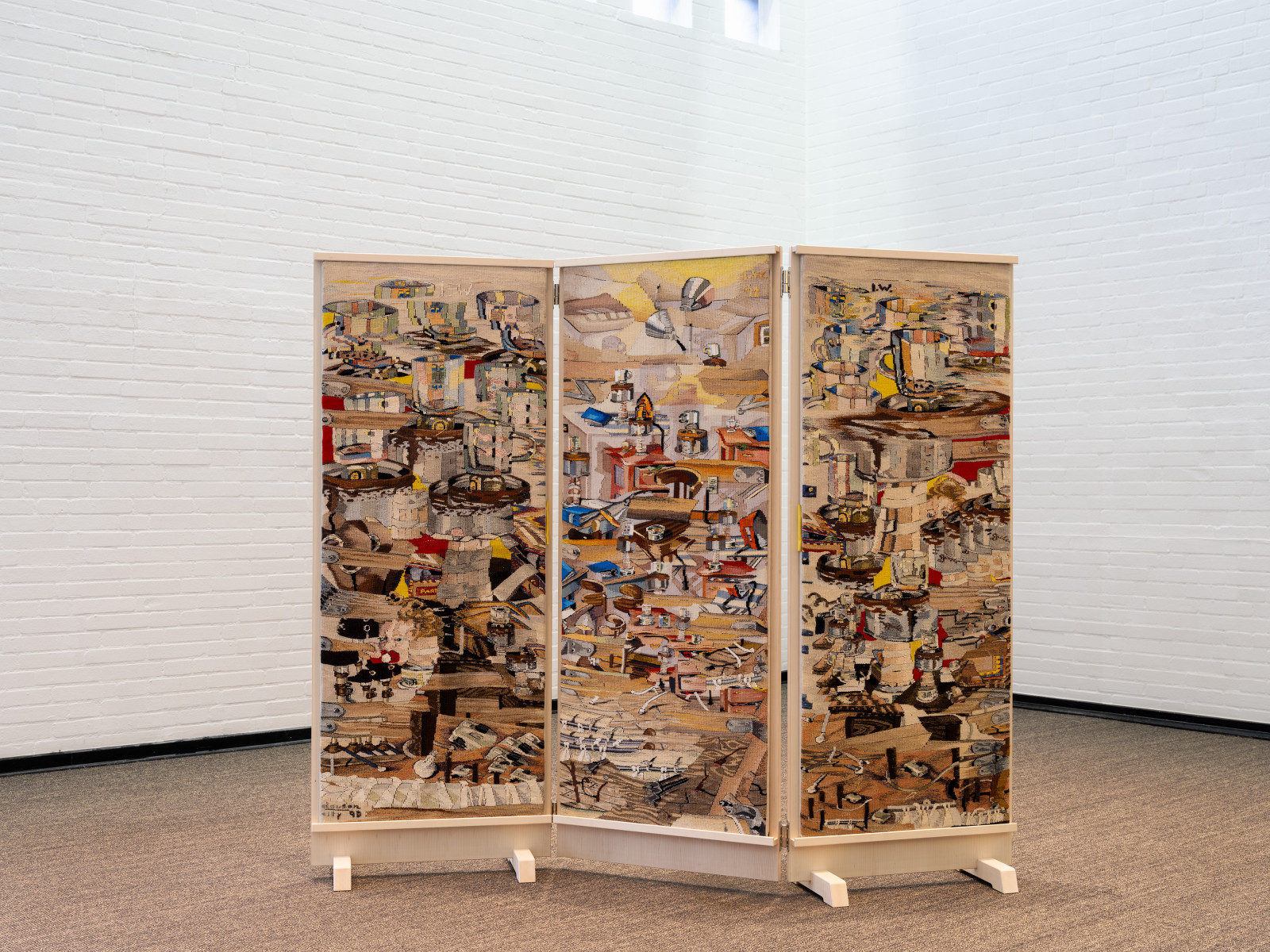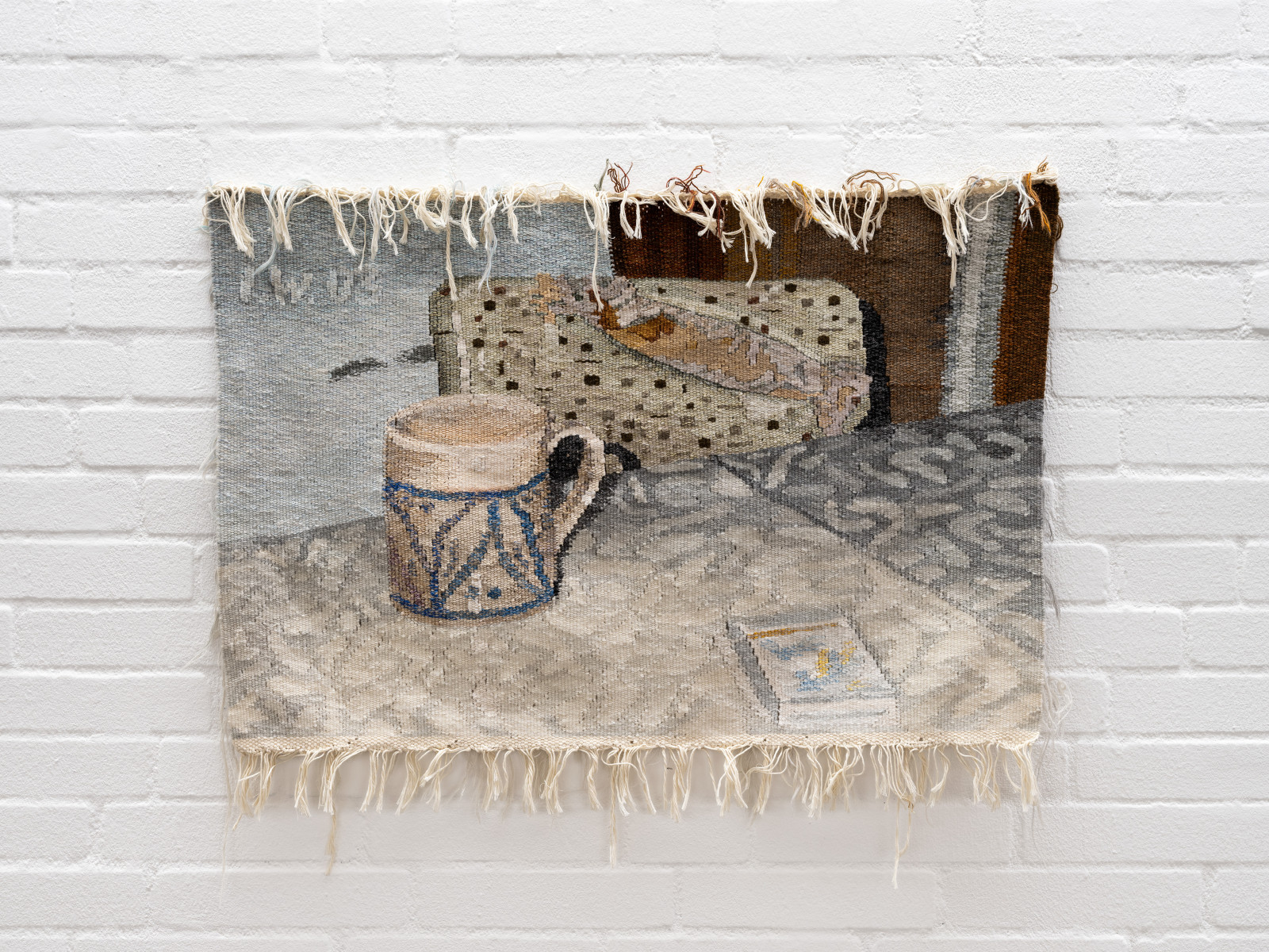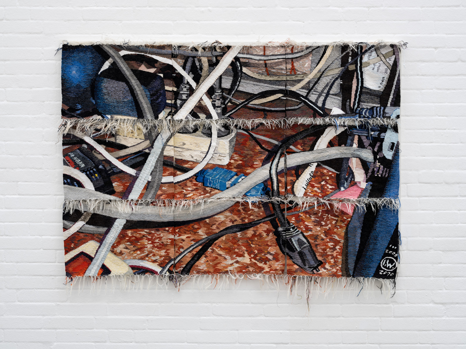 Wiener’s exhibition at the Kunsthalle takes a retrospective approach and provides insights into the variegated oeuvre of the artist, who is best known for her tapestries that she rediscovered as a contemporary medium. The tapestries she initially made with VALIE EXPORT for Friedensreich Hundertwasser and later in a years-long collaboration with Dieter Roth mainly focus on her everyday surroundings and are dedicated to what is seemingly insignificant and incidental: For example, a tangle of cables under the desk, pipes under her bathroom floor, scenes in front of her window, shopping lists, or shoes. Wiener’s tapestries are “entirely autobiographic,” as Michaela Leutzendorff Pakesch, the co-curator of the show, points out. “She weaves remnants of life, fragments of memories, things and places that have touched her.” These trivia appear to contradict the essence of tapestry weaving, which, due to the elaborate and slow process, was traditionally reserved for significant moments and motifs. The protracted and time-consuming activity associated with the process of weaving that—like cooking and acting as a host—demands constant attention and care, can be read as a feminist practice based on a feminist ethics of care. A practice that, by shifting the “action” from immediacy, independence and autonomy to duration, dependence and relationality, stands in opposition to the confrontational actionist practices of many artists of Wiener’s generation.