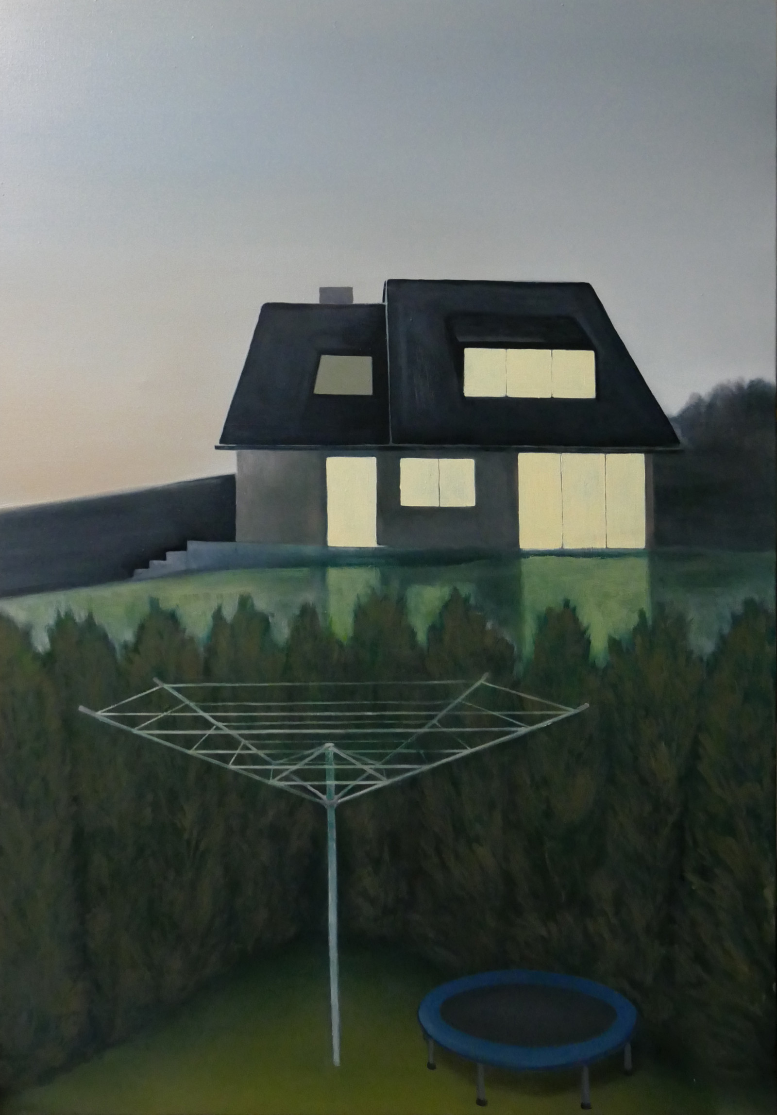 Simon Modersohn’s recurring motifs are rural detached houses with mysteriously illuminated windows. The unspectacular buildings are usually surrounded by meticulously tended gardens, enriched with accessories available at any DIY store. Heat sources such as home saunas or work lights appear repeatedly in his pictures, lending them a suggestive ambivalence. Simon Modersohn seeks a path to spiritual depth and truthfulness in the depiction of complex life contexts through painting. For him, the narrative only develops in the painting process. Last but not least, he is also interested in playing with changing perspectives and points of view. His imaginary scenes do not require a person, yet there are traces of previous human activity that subtly permeate the pictures. Simon Modersohn’s pictures develop their enormous density and balance in the finely balanced field of tension between presence and absence, coincidence and memory, tragedy and comedy, big city experience and country life.
