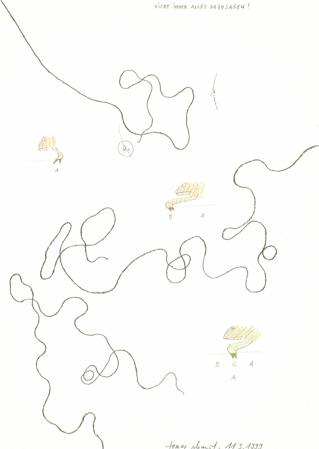 In addition to the actions, Tomas Schmit also worked with language and text and began to draw at the end of the 1960s. Over the course of around four decades, he created a large number of individual drawings, editions, original reproductions of drawing series, books, texts and a film entitled “e-constellations”. In terms of content, he dealt with questions such as “how does a chameleon know what color it should be?” or “can people think”, mostly observations and phenomena from evolution, brain and behavioral research or perception and linguistic logic. Tomas Schmit’s artistic reflections were not only highly recognized in the art world through solo exhibitions at the Kunstverein Hamburg (1977), the Kölnischer Kunstverein (1978), the Galerie Michael Werner, Cologne and New York (1986 and 1994), the DAAD Galerie Berlin and the Sprengel Museum Hannover (1987), the Kunsthalle Portikus, Frankfurt am Main (1997) and posthumously at the Museum Ludwig, Cologne and the Falckenberg Collection, Hamburg (2007), as well as his participation in documenta 6 in Kassel (1977). Renowned scientists also paid him respect. For example, in 1990 the cyberneticist Prof. Dr. Braitenberg recommended Tomas Schmit’s book “Erster entwurf (einer zentral ästhetik)” to “physicists and other beginners” in a review in the specialist journal “Spektrum der Wissenschaft” as an “introduction to brain science”. In this respect, Tomas Schmit is also one of the most prominent pioneers in the relationship between fine art and science, which is currently enjoying a revival.